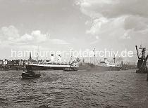 728_617 Das Seeschiff OAKLAND wird mit Schlepperhilfe aus dem Hamburger Hafen gezogen - dicker schwarzer Qualm kommt aus den Schornsteinen der Hafenschlepper. An der Überseebrücke liegt das Passagierschiff MONTE PASCOALf und im Hintergrund rechts sind der Kaispeicher A und das Gasometer auf dem Großen Grasbrook zu erkennen. |