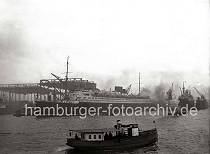 730_B_659a Hafenschlepper liegen an den Dalben bei der Übersee- brücke - eine Barkasse mit Hafen- arbeitern legt am Sandtorhöft an, weitere Hafenfahrzeuge überqueren die Elbe.  >>>